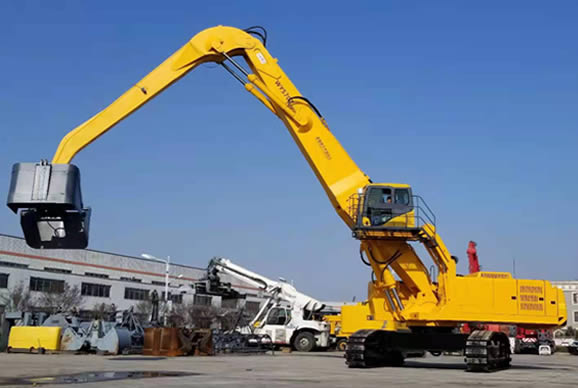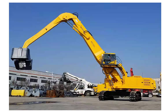 該設(shè)備分別采用了大功率“國三”標(biāo)準(zhǔn)發(fā)動(dòng)機(jī)、380V 西門子電機(jī),以及全套采用施耐德控制系統(tǒng)拖動(dòng)控制兩套力士樂液壓動(dòng)力機(jī)構(gòu)及先導(dǎo)液力控制的世界首臺(tái)“雙動(dòng)力”抓料機(jī)。該機(jī)設(shè)計(jì)了寬體結(jié)構(gòu)梁,以及加強(qiáng)型可更換正、負(fù)差的二節(jié)式作業(yè)主臂,最大吊重量達(dá) 25 噸、最大作業(yè)半徑為 18米。在 5 至 12 米作業(yè)半徑內(nèi),可配備 5.0 立方蚌殼抓斗,或 2.5 立方梅花廢鋼抓斗。